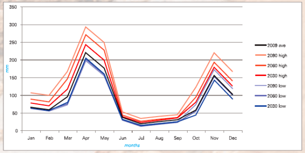 - High and low projections of the mean monthly precipitation in Nairobi for 2030, 2060 and 2090, as well as the actual mean monthly precipitation in 2009. Source: Thornton, 2010.