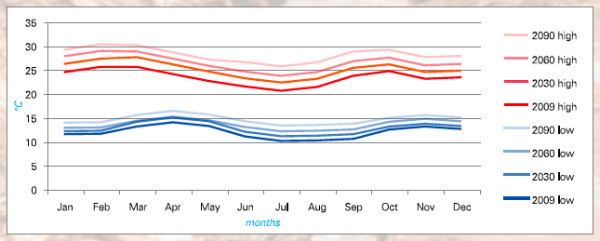 - Projections of mean monthly high and low temperatures in Nairobi for 2030, 2060 and 2090, as well as the actual mean monthly temperatures for 2009. Source: Thornton, 2010.