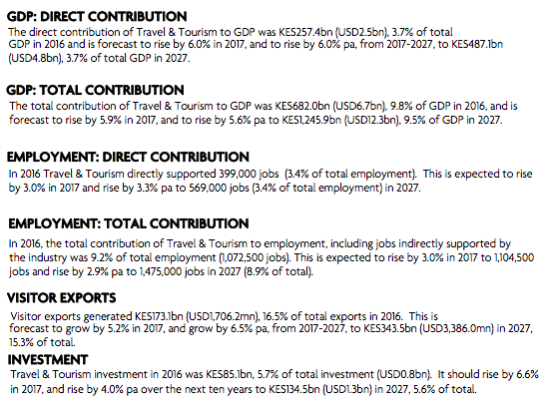 Tourism is a major part of the Kenyan economy. In 2016 the total contribution was US$2.5bn which is equivalent to 3.7% of the total economy.