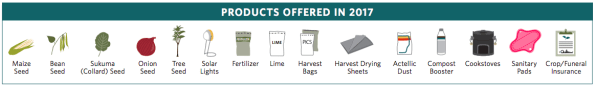 It claims to work with over 200,000 farmers in Kenya. It lends the things needed for farms to be successful – such as seeds, fertilizer, bags to transport crops, and so on. It also helps farmers with social necessities such as cookstoves, lighting and menstrual hygiene products.