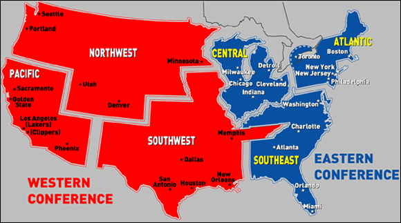 The map below (NBA, 2017) shows the locations of the teams in the full NBA (not including those in associated leagues like the D-League, a minor NBA league).