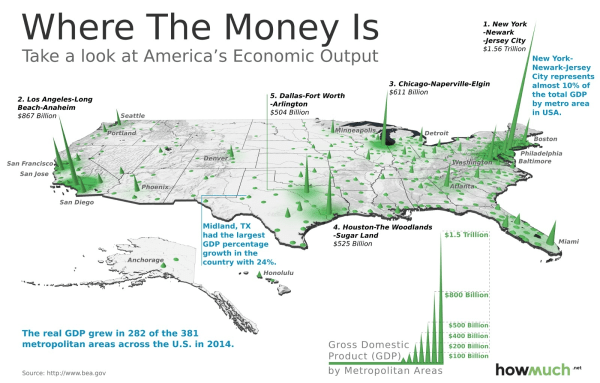 - Map showing economic output across the United States of America. Source: HowMuch, 2014. This 3D Map Visualizes the U.S. Economy in a New Way. https://howmuch.net/articles/where-the-money-is-by-metro-area Accessed 27th November 2017