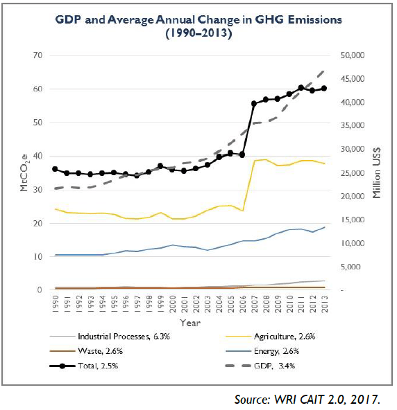 - Kenya’s GDP and and Greenhouse Gas (GHG) emissions, 1990 to 2013. Source: Government of Kenya, 2013.