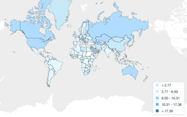 - Worldwide CO2 emissions (metric tons per capita), 2014. Source: World Bank, 2014.