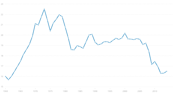 - USA CO2 emissions (metric tons per capita), 1960-2014. Source: World Bank, 2014.