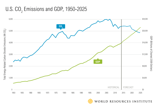 - US CO2 and GDP, 1950-2025. Source: Aden, 2016.