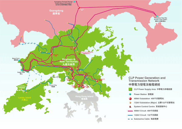 The CLP Power company owns and operates the transmission infrastructure that carries electricity to homes and businesses across the New Territories. The map below shows the distribution network.