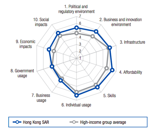 In 1998 Hong Kong’s government began its Digital 21 Strategy, which has been regularly updated since (Tech Wire Asia, 2018), which coordinates the overall plans to ensure that Hong Kong developed a leading role in internet communications in Asia. This led to the 2006 launch of the GovHK portal, a one-stop-shop for all online government services (GovHK, 2019). In 2015 the strategy was further enhanced by the establishment of an Innovation and Technology Bureau. However, Hong Kong has maintained a very competitive approach to internet services: companies have to comply with relatively little regulation, and any company is allowed to bid for a licence regardless of the location of its headquarters. These efforts have led Hong Kong to have one of the most advanced networks in the world. In the 2016 Global Information Technology Report (Baller, Dutta, and Lanvin (eds.) 2016) Hong Kong ranked 12th in the world for Networked Readiness overall and 25th in the world for the quality of its infrastructure (out of 139 countries and territories). The radial graph below shows the report’s analysis of Hong Kong’s network readiness compared to other High Income countries and territories.