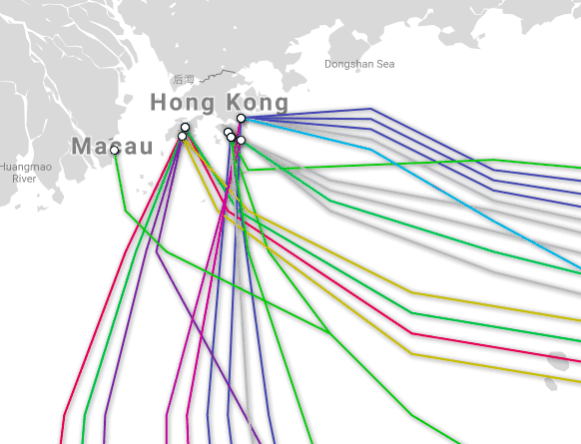 As well as Hong Kong’s local connections, it is also very well connected to the rest of the world via undersea cables, as shown on the two maps below. Despite the cities of Dongshan, Shenzhen, Guangzhou and Zhuhai having a combined population of well over 20 million people, it is Hong Kong (population 7.2 million) that is directly connected via internet cables to the United States, Japan and other countries.