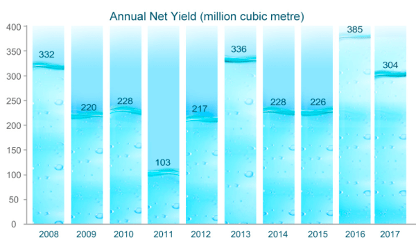 - The annual net yield is the amount of freshwater is gathered and stored from within Hong Kong. Source: Water Supplies Department, 2017b.