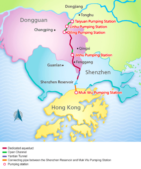 - The network of aqueducts, canals, tunnels and pipes that transport water from the Dongjiang River Basin to Hong Kong. Source: Water Supplies Department, 2017.