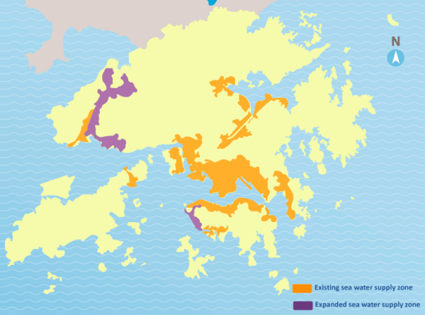 - Areas of Hong Kong covered by flushing sea water. The orange and purple areas combine to reach over 85% of the population. Source: Water Supplies Department, 2018.