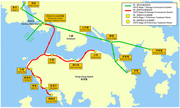 The solution to this problem was the Harbour Area Treatment Scheme (HATS). HATS is a system of tunnels that carry human waste away from the harbour to a treatment facility on Stonecutters Island, several kilometres from the harbour. Stage 1 of the scheme was begun in 2001, with Stage 2A completed in 2015 (Drainage Services Department, 2018). (Note: Stage 2B has not yet taken place at the time of writing, and is not considered an urgent priority.) The map below shows the locations of the tunnels. The green lines show the 23.6 kilometres of tunnels that take 75% of the sewage previously dumped in the harbour to the treatment facility. The red lines show the 21 kilometres of tunnels taking the other 25% of waste (GovHK, 2018).