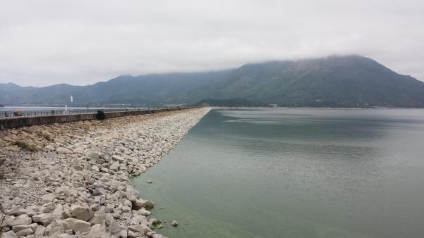 - Plover Cove dam wall. To the right is the sea; to the left is the reservoir. The dam wall is over 1km long.