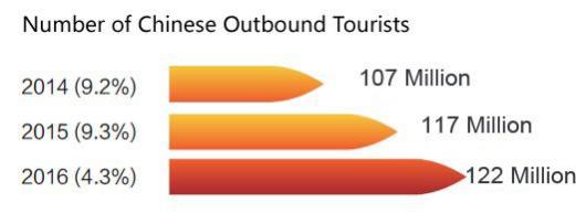 - Source: World Online Travel, 2017. Chinese Outbound Tourism Statistics in 2016: 122 Million Chinese Tourists Make Outbound Trips, Spend $109.8 Billion. http://news.travel168.net/20170203/43145.html Accessed 1st November 2017.
