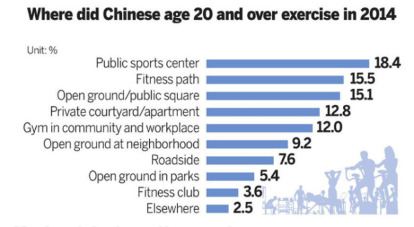 This is partly the result of the government’s policy on fitness. After the Beijing summer Olympics in 2008, the State Council made ‘Sports for All Day’ annually on 8th August. In 2016 it was announced the National Fitness Plan to 2020 would follow from the 12th National Plan for 2011-2015, which resulted in an increase in medium intensity exercise participation from 28.2% of the population in 2007 to 33.9% by 2014 (Xiaochen, 2015).