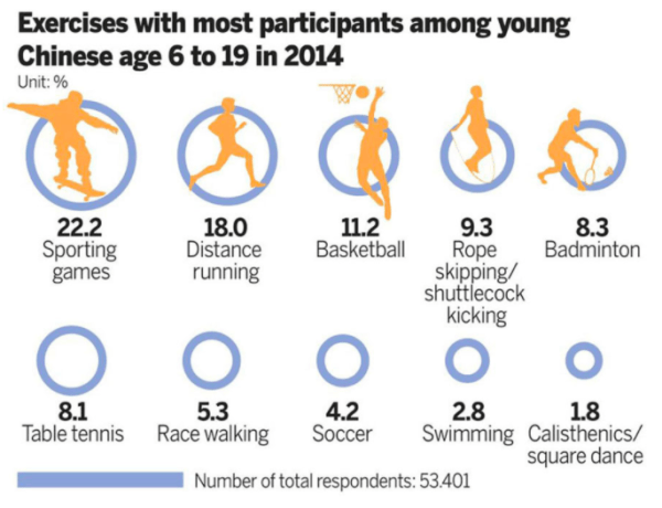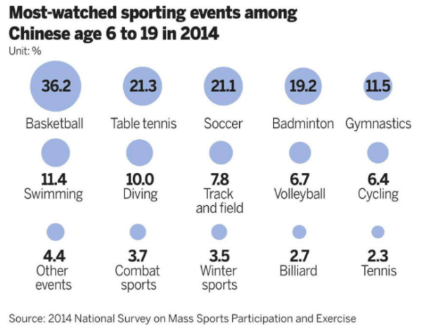 Despite a strong focus on national pride in elite sporting competitions, historically China has not been considered a sporting nation. This has begun to change; recent growth is not just amongst elite athletes. For example, visits to ski regions were 5.5 million in 2009, but by 2016 had reached 15.1 million, and Beijing is the host of the 2022 Winter Olympics which is anticipated to be a major spectator event (Klingelhöfer, 2017). Similar growth is happening in many sporting sectors, such as football. The infographic below shows the variety of sports that interest people in China (State Council, 2015).