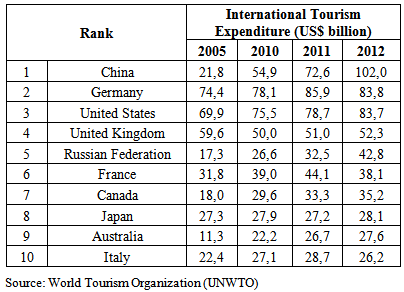 Chinese tourism has similarly grown. The table below shows the spending in US dollars on international tourism by citizens of selected countries, showing China has increased consistently and is now the top spender in the world (Jian-jun and Nas, 2014).