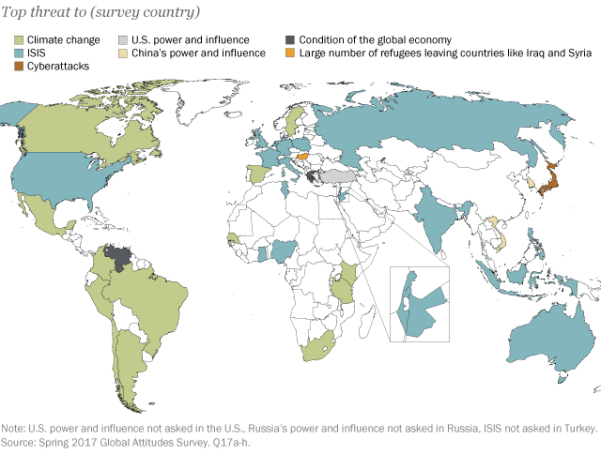 Poushter and Manevich, 2017. Globally, People Point to ISIS and Climate Change as Leading Security Threats. http://www.pewglobal.org/2017/08/01/globally-people-point-to-isis-and-climate-change-as-leading-security-threats/