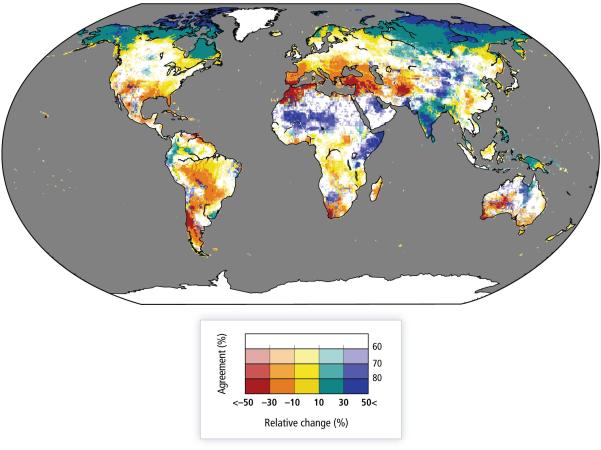 - The percentage change of mean annual streamflow if temperatures rise 2°C above the the average temperature of the period 1980-2010. Red colours indicate a strong decrease, while blue colour represent a strong increase. The strength of the colour shows how strongly different studies agree; for example, very dark blue means that almost all the studies agreed that there would be a major increase in streamflow. Source: Schewe et al, 2013.