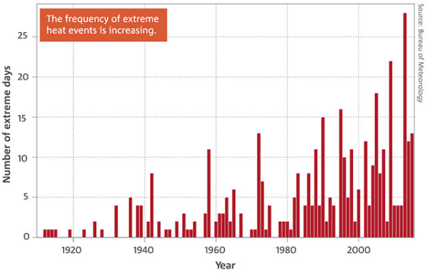 A good example of the increase in extreme weather is that of heat. The Australian Bureau of Meteorology reports an increase, as shown on the graph below. “Extreme days are those above the 99th percentile of each month from the years 1910-2015. These extreme events typically occur over a large area, with generally more than 40 per cent of Australia experiencing temperatures in the warmest 10 per cent for that month. The frequency of very hot (greater than 40°C) daytime temperatures has been increasing since the 1990s.” (Bureau of Meteorology, 2018).