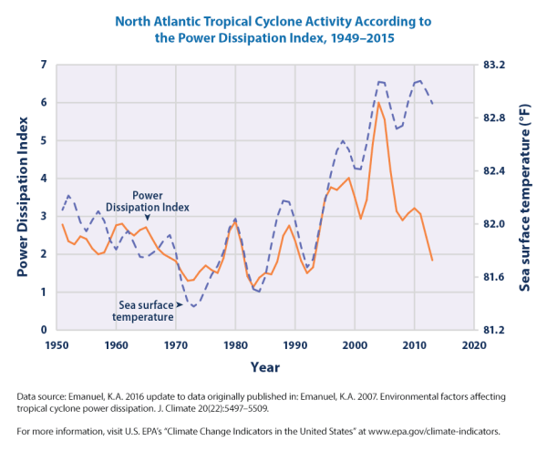 - Power Dissipation Index values for hurricanes in the North Atlantic. Source: EPA, n.d.b.