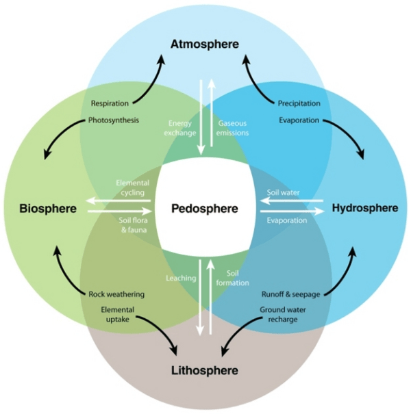 - Interactive processes linking the pedosphere with the atmosphere, biosphere, hydrosphere and lithosphere. Nature Education, 2012.