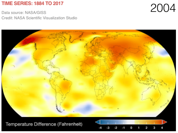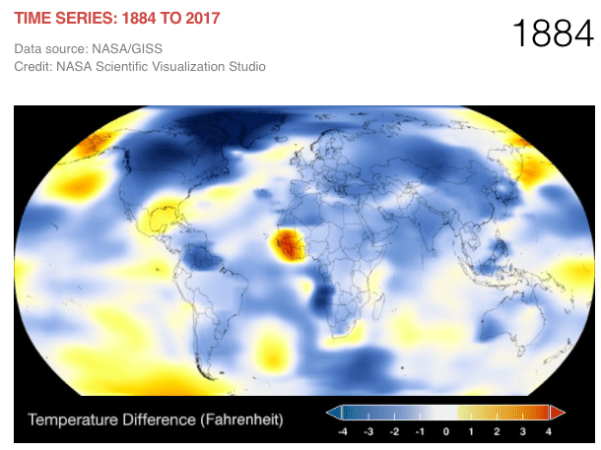 The maps below show the average variation in temperatures at the Earth’s surface in the five years before the date shown, compared to the average temperature between 1884 and 2017. (Note : 1 degree Fahrenheit is equal to around 1.8 degrees Celsius.) It clearly shows that the temperature is rising throughout the 20th century and beyond, but that some areas such as parts of the Southern Ocean (around Antarctica) become somewhat cooler.