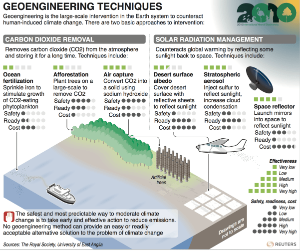 Royal Society, 2009. Preliminary Overall Evaluation of Geoengineering Techniques, from The Royal Society Report ‘Geoengineering The Climate’. https://royalsociety.org/~/media/royal_society_content/policy/publications/2009/8693.pdf Via https://2020science.org/2009/09/01/geoengineering-the-climate-a-clear-perspective-from-the-royal-society/ Accessed 25 March 2018.