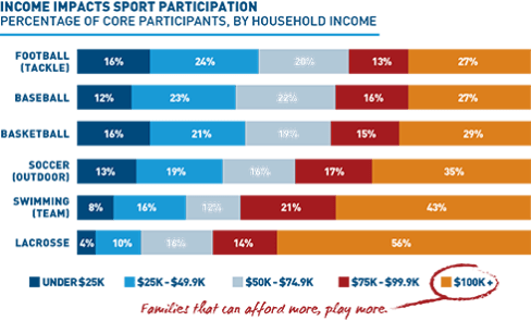 The graph below shows the participation in sports for different household income levels in the United States. The data (sourced from the Sports & Fitness Industry Association) identifies that households on lower incomes are less likely to participate in sport.