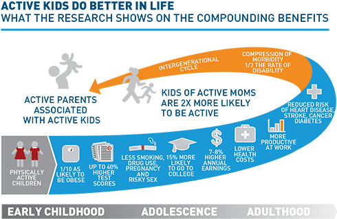 This apparent link may exist because of a positive multiplier effect, also known as cumulative causation. The graphic below shows how an active childhood can lead to a higher income in life and the passing of the benefits to the next generation, creating a virtuous spiral of improvement. However, there are multiple factors involved in such an effect and it is not appropriate to suggest that more physical activity is the only solution to societal problems.