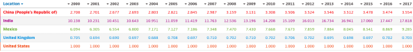 The table below shows the PPP for selected countries. Essentially, the higher the value, the more you can buy in that country with US$1. So, in India, you can buy much more with the same US$1, which tells you that product are cheaper but in the UK you can buy less which tells you products are more expensive. Notice that the US dollar remains constant, as every currency in the world is compared to it.