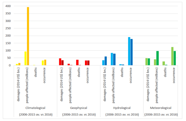 - The impacts of disasters. The left bar in each pair shows the 2006-2015 yearly average. The right bar shows the 2016 level. Source: Guha-Sapir, Hoyois, Wallemacq and Below, 2016.