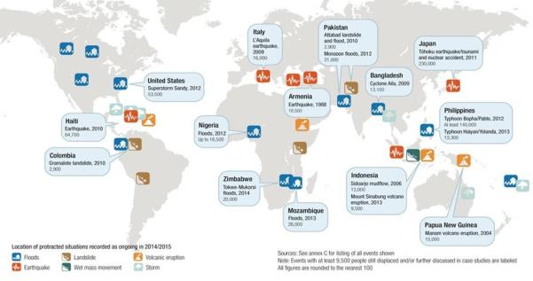 Currently, climate events are a factor in several displacements of people worldwide, such as tropical cyclones (also known as typhoons and hurricanes) which force people to leave their homes. However, many of the world’s hazardous events causing migration are not climatic in nature, such as earthquakes and civil war. The map below shows some selected ongoing situations from 2015-15.