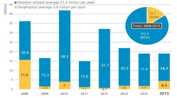 - Weather related displacement compared to geophysical (landslides, earthquakes and volcanoes) displacement. Source: UNFCCC, 2016.