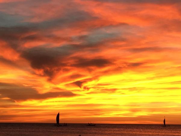 - Boracay, Philippines: Stunning tropical sunsets are the result of the interaction of light and atmospheric particles. The red effect is caused by gases in the atmosphere which scatter red light less than other wavelengths, so the deep orange colours are what we are able to see after this remaining light hits clouds which reflect it towards us.
