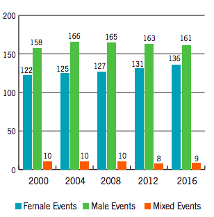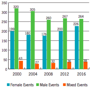- Events at Paralympics by gender. Source: Women’s Sports Foundation, 2017.
