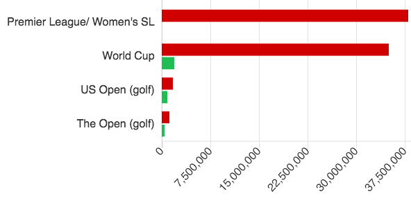 - Biggest gaps in prize money. Key: Red: Amount paid for men’s event (GB£). Green: Amount paid for women’s event (GB£). Source: Perasso, 2017