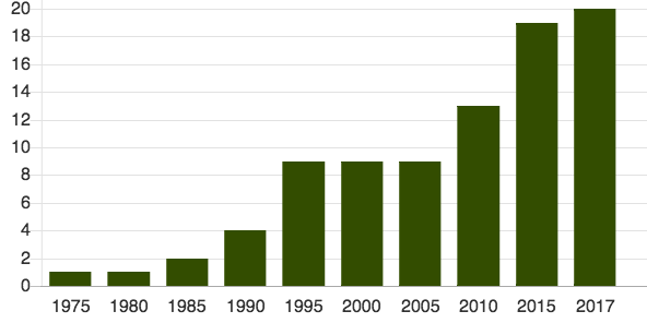 - Sports paying equal prize money, Number of sports by year. Source: Perasso, 2017