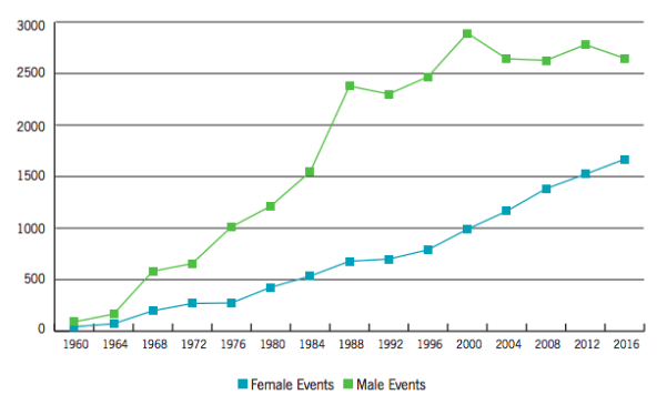 Women’s participation in international sports has been increasing for some time. The graph below shows the number of events at the Olympics and shows how women’s sports have been gaining more recognition.