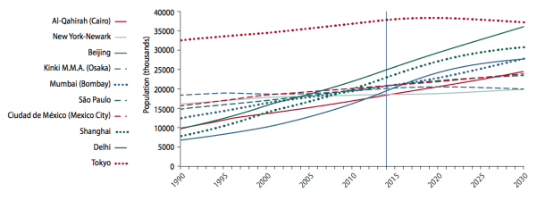 - The ten largest urban agglomerations in 2014 show varied growth patterns both in the recent past and in future projections. Source: UNPD, 2014, p14