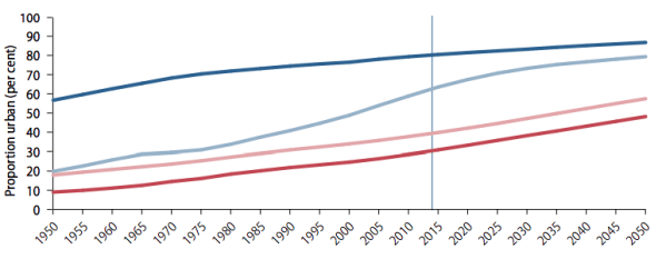 - Proportion urban by income group of country, 1950–2050. The top line is HICs; then Upper MICs, Lower MICs, and finally LICs at the bottom. Source: UNPD, 2014, p10.