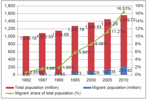 - Number and Share of Migrants in the People’s Republic of China, 1982–2010. Source: Lu and Xia, 2016 p8.