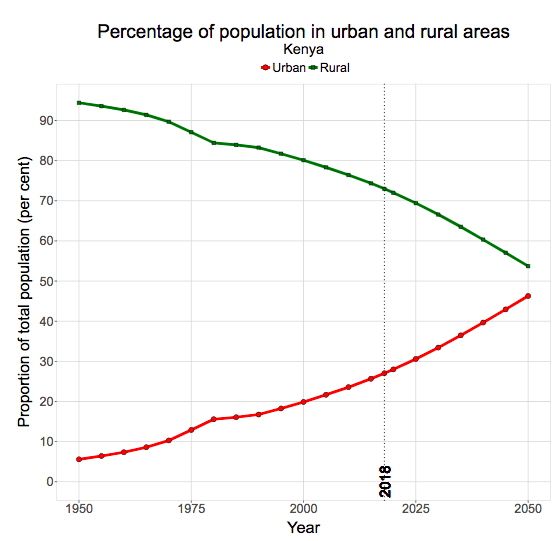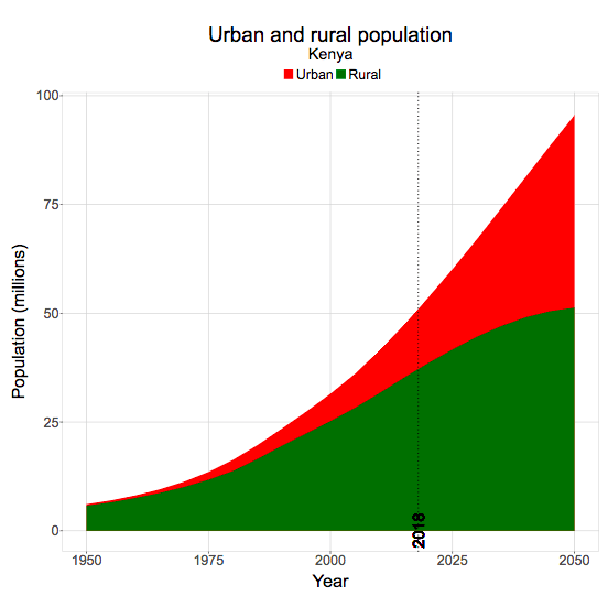 - Kenya is forecast to have urban growth but the rural population will also continue to grow up to 2050, albeit at a slowing rate. Source: ESA, 2018.