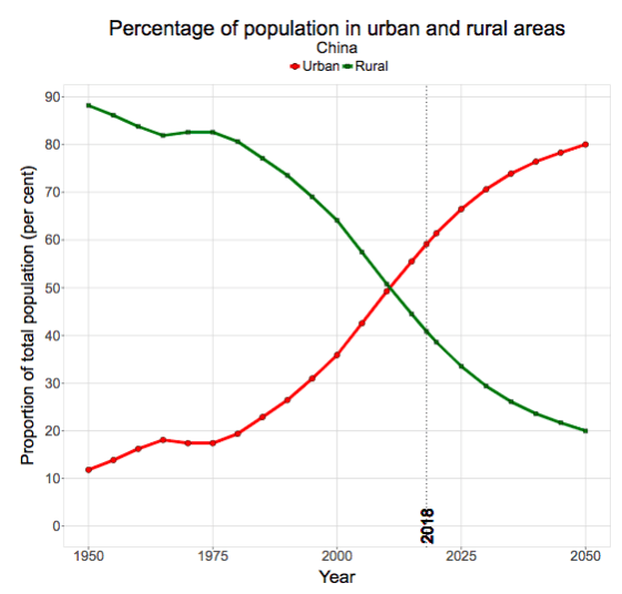 - China’s urban population is growing rapidly, mainly due to in-migration from rural areas. Source: ESA, 2018.