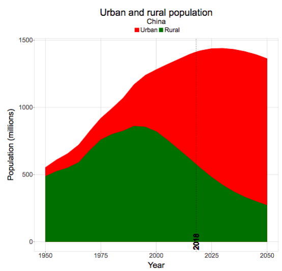 In the next decades, China’s population will begin to decline thanks to a low level of new births and a large number of people entering old age. However, the urban population will continue to grow due to in-migration. This will mean that the population of the rural areas will decline even faster, due to a out-migration and a natural decrease in the population from births and deaths (also known as negative natural increase).