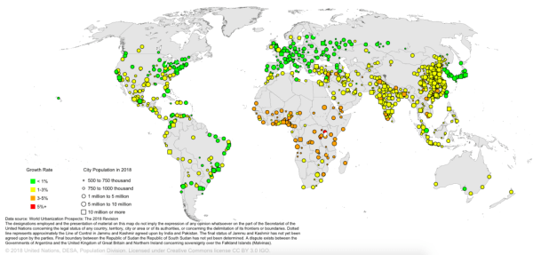 - Growth rates of urban agglomerations by size class, 2018-2030. Future growth is going to be in Asia and Africa – but not necessarily in the cities that are already largest. Source: UNDP, 2018c.