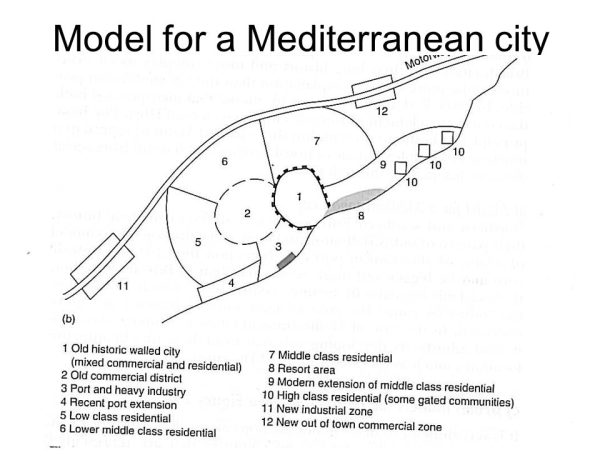 Harm de Blij was a geographer who, among many other interests, studied the urban development of cities in Sub-Saharan Africa. He recognised that there was frequently an old CBD with colonial buildings and some redevelopment (especially tower blocks). However, he identified that cities often have an ‘open air market zone’ in which informal economic activity takes place. Residential areas are distinguished from one another not only by household wealth (the poorest are often on the edge of the city, because new migrants set up squatter settlements there) but also by ethnicity. This is partly because some African countries were created from arbitrary colonial borders rather than from tribal or national groupings, so ethnically similar people group together when they migrate to the city. (Look at a modern map of Africa and observe the large number of straight-line borders. Many of these reflect agreements made by European powers in the 1984-5 Berlin Conference, which separated territories between European countries for the purposes of colonial expansion. When countries achieved independence, these borders were retained.)