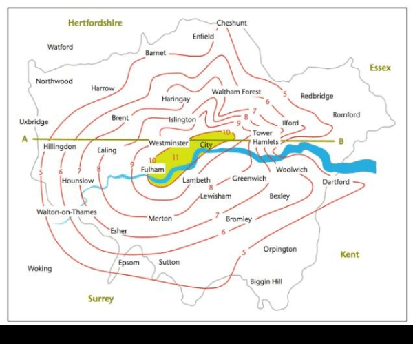 - Isothermic map of London, showing the temperature rising towards the centre of the city. Source: Bhatt, 2016