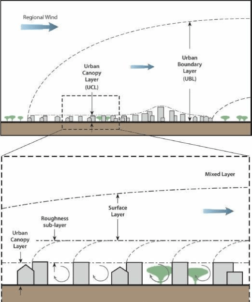 Wind is affected from ground level, and the point in the atmosphere at which wind is no longer affected by buildings is known as the Urban Boundary Layer. The diagrams below show how wind patterns will change due to the interference of buildings.